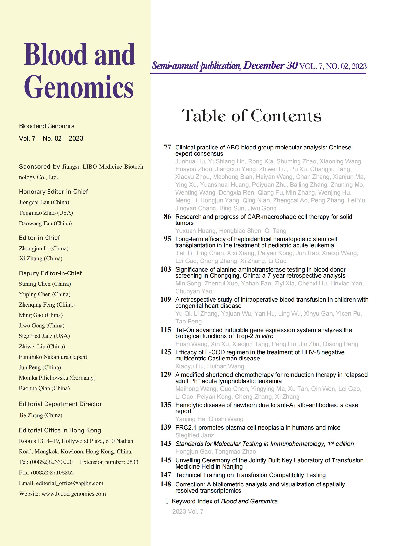 2023年12月30日,《Blood and Genomics》2023年二期正式發表。本期包括Review、Original Article、Brief Report、Case Report、Letter to the Editor以及Books and News等類型文章,對ABO血型分子分析、CAR-M細胞治療實體瘤、單倍體造血干細胞移植治療兒童急性白血病、先天性心臟病患兒術中輸血等輸血以及血液領域的熱點話題進行研究與探討。